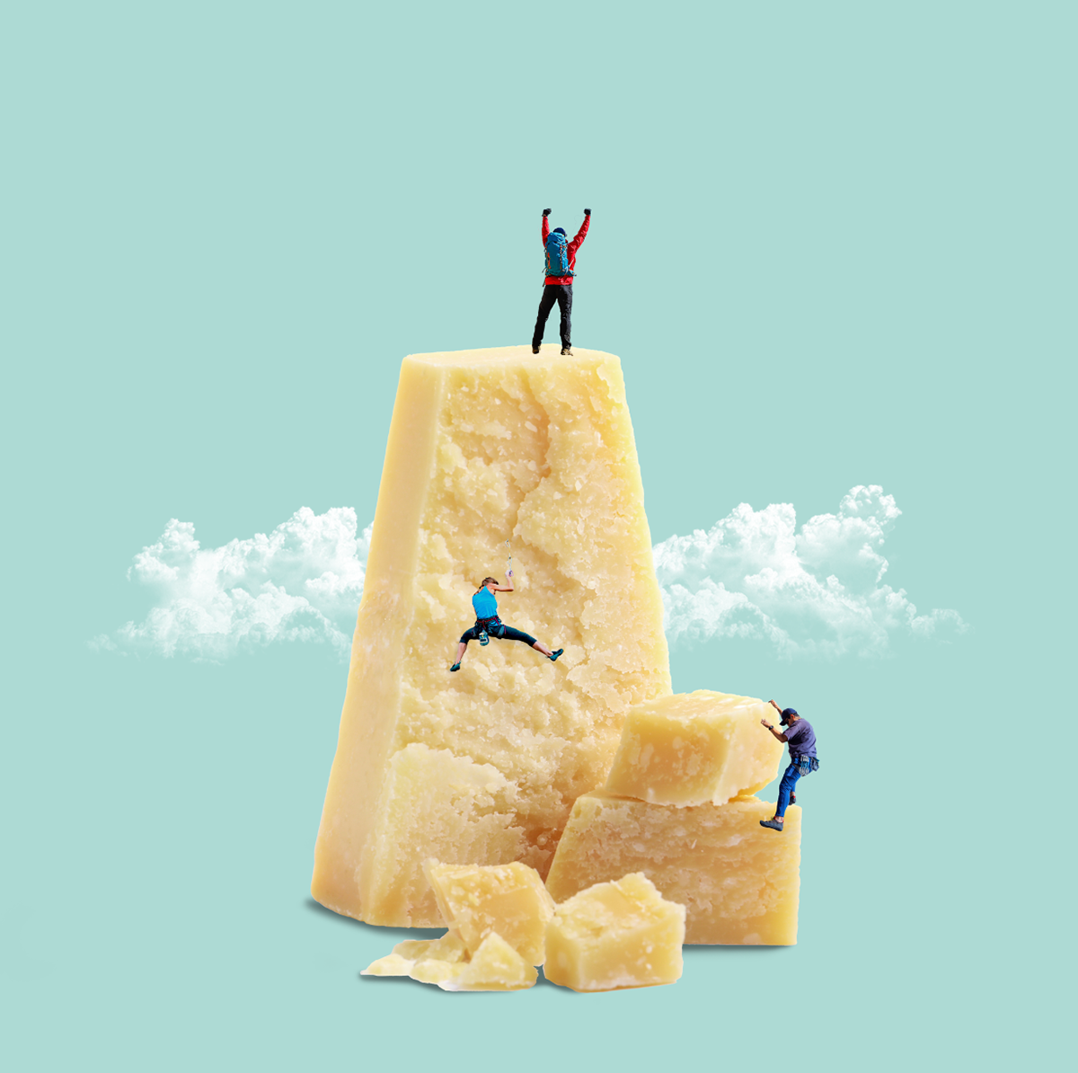 Montaje de arte digital creado con Adobe Photoshop en el que tres escaladores ascienden por un bloque de queso Grana Padano, transformando un ingrediente cotidiano en una pared vertical digna de una gran expedición.